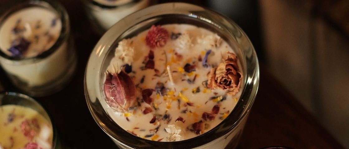 Avant que la cire n’ait totalement durci, parsemez la surface de quelques fleurs séchées. Attention, veillez à ce que les fleurs soient éloignées de la mèche pour ne pas prendre feu à l’allumage.